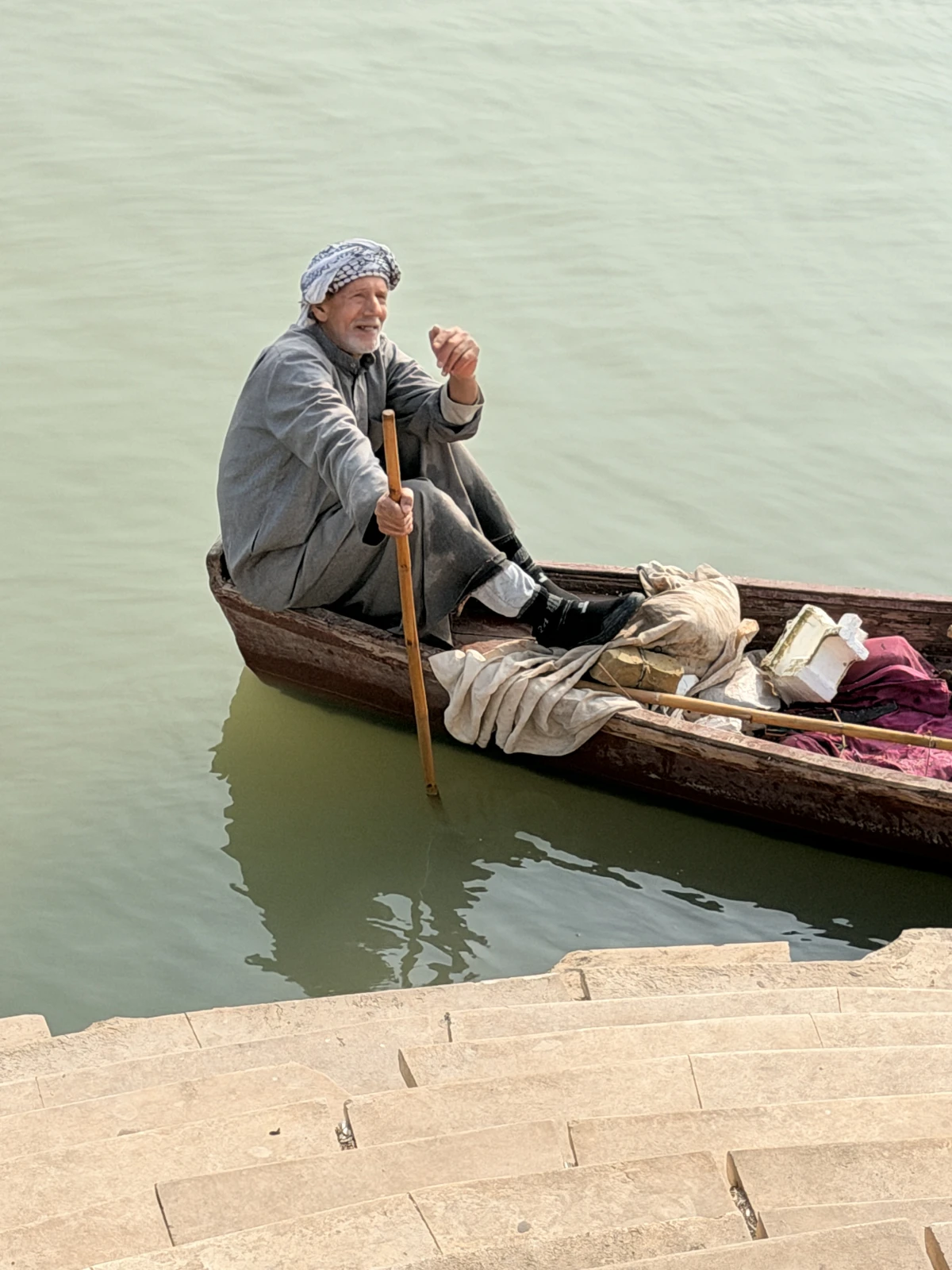 25/12/2025A las 8 en pie, desayuno rico pero café malo, sin dormir ni un solo minuto, pero ni uno, me estalla la cabeza y mi primera visita el punto de unión donde se juntan el Tigris y el Éufrates, 77 kms sin cinturón porque está roto, pero el del conductor no… en fin y porque me pilla de paso para seguir camino del norte, pero vamos, no tiene nada, si, un río viene por un lado, otro por el otro, se juntan en uno solo y ya, no hay más misterio, molaba un hombrecillo pescador que estaba ahí con su barquita, nada más.