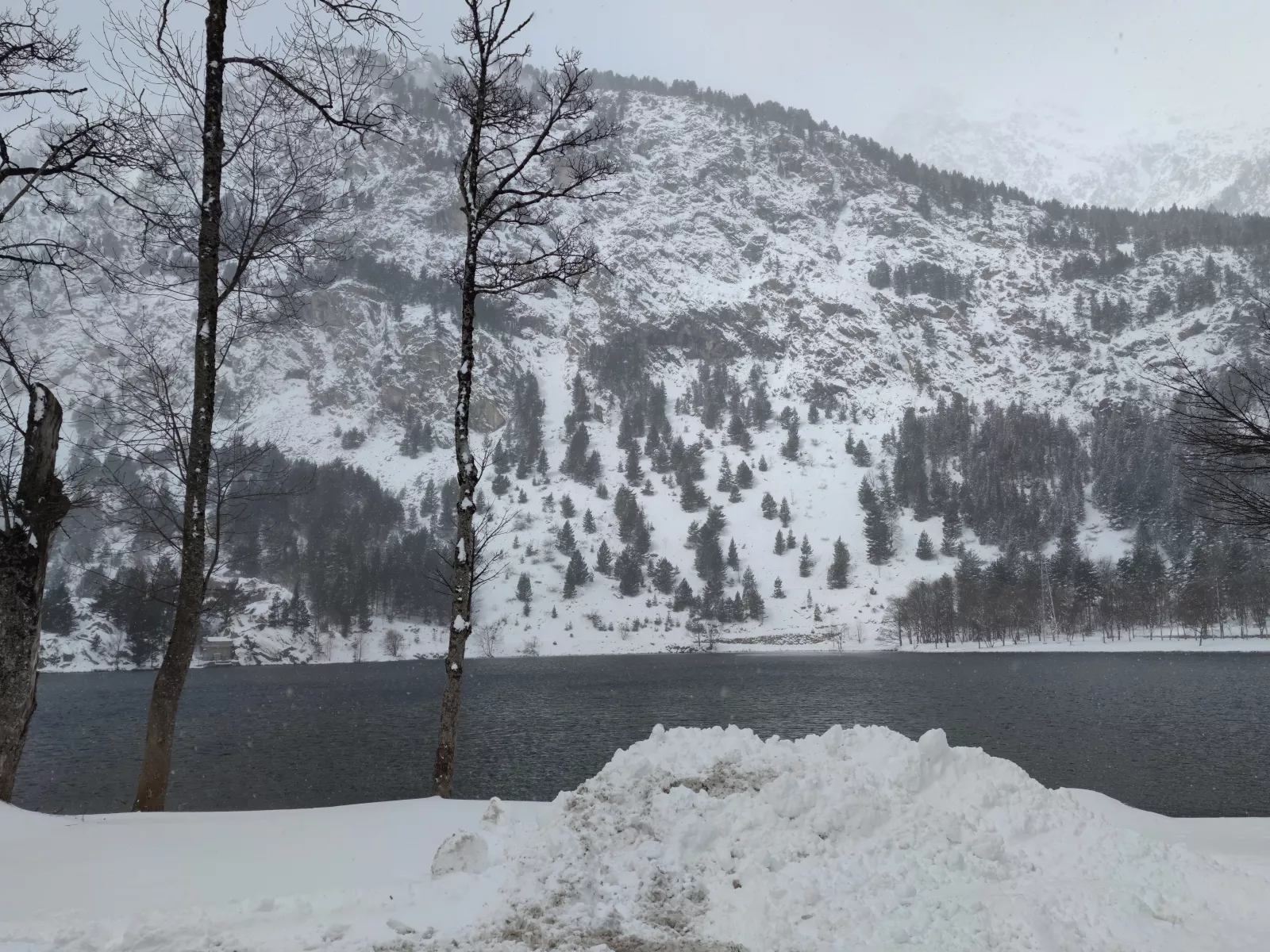 a la mañana siguiente, nos fuimos de nuevo a Baños de Panticosa, pero estábamos indecisos ya que estaba nevando y conducía Antonio, con sus ruedas mixtas, pero como somos unos aventureros, para allá que fuimos y muy bien hecho, porque el camino fue divertido, algún patinazo que otro, curvas a -16 por hora, y 3 horas después llegamos para hacer un trayecto de 7kms. y empezada a nevar cada más y más, muu negro se estaba poniendo aquello
