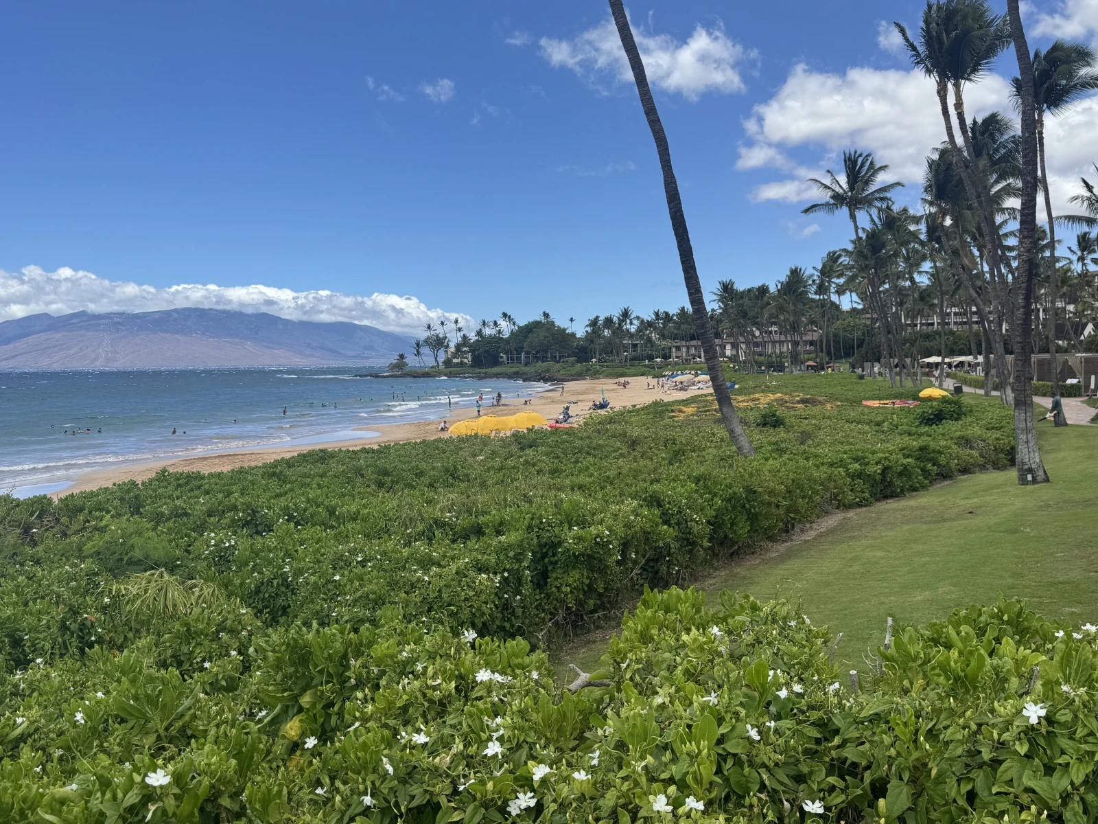 Pues visto, chulo, pero lo de media hora se lo inventan, 3 minutos, literal y hechos por mi, pero mi primera impresión de Hawaii, mola mucho esos montañones verdes y como me quedan un par de horas hasta hacer el checkin, me voy a la costa oeste a pegarme el primer chapuzón en la playa de Kanaapali y aquí viene la primera decepción después de la primera genial impresión, de que me sirve tener un Ferrari si no paso de 40? increíble que de coches hay, que de camiones, un solo sentido, he tardado 1 hora para 30 kms... y yo pensando que iban a ser como las carreteras de usa continente, infinitas y sin radares, pues toma, eso sí, la carretera mola bordeando la costa y ya se van playitas chulas con surferos y la playa está, madre mía lo que me ha costado aparcar, es la típica de resorts de lujo, flipo con la pasta que tiene la gente, está bien, chula, pero ves a más gente en las piscinas que en la playa, no lo entiendo.