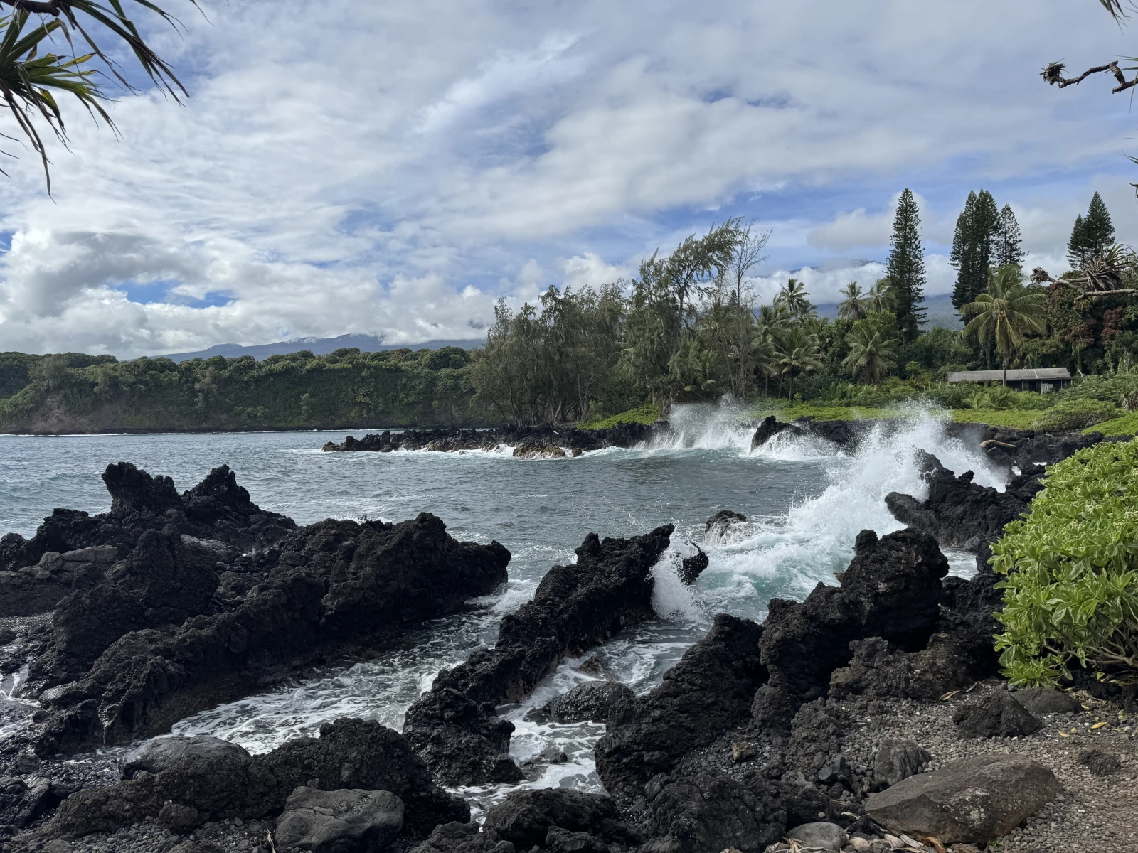 Decimocuarta parada Black Sand Beach a la vuelta, no me han dejado entrar, se necesita reserva, no lo sabía y he preguntado si puedo reservar para el momento y me dicen que no, que está lleno, flipo Decimoquinta parada pueblo de Hana, me ha molado, es increíble, estás en una remota isla alejada del mundo y aún así la gente vive en un pueblo remoto alejado de la isla que se tarda tranquilamente hora y media en hacer 60 kms sin paradas, alucino y me asombra, qué guay, creo que les tengo envidia, no deben tener muchas preocupaciones por aquí a parte del comer día a día, claro