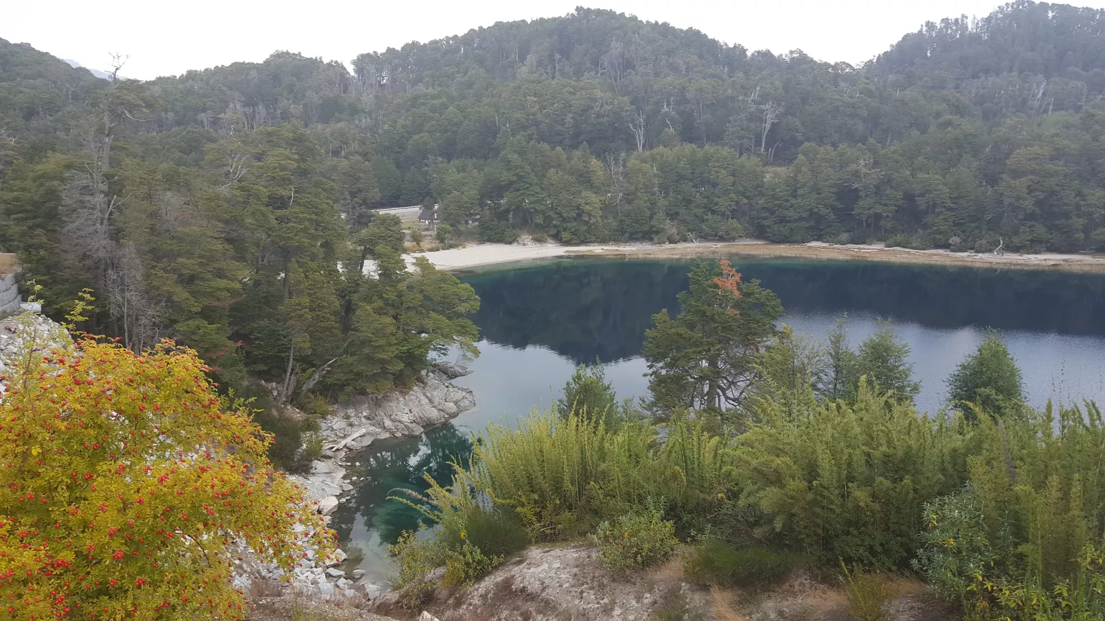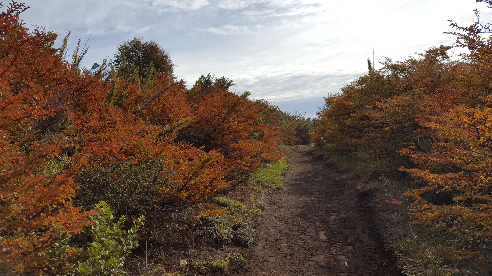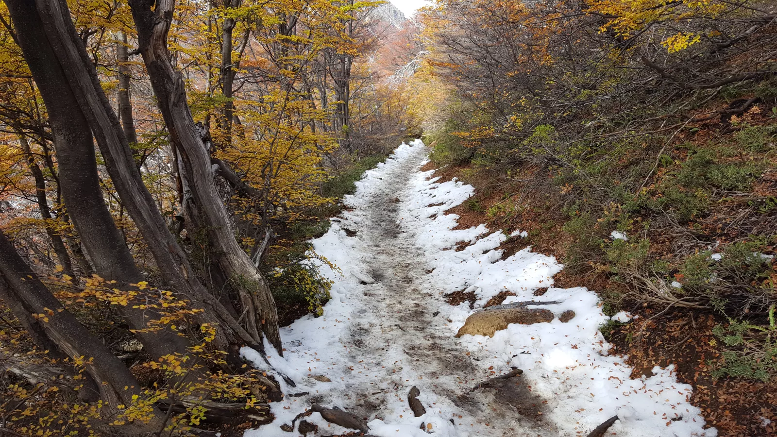 al principio camino por especie de bosque pero sin grandes árboles y luego durante más de 1 hora bordeando el lago por un sendero resbaladizo lleno de barro, malo para mí y para mis zapas y con cuidao porque a veces hay precipicio, bueno, pasado eso entro en especie de bosque muy lindo porque se veían partes nevadas que se mezclaba con el color rojo de algunos árboles, chulo