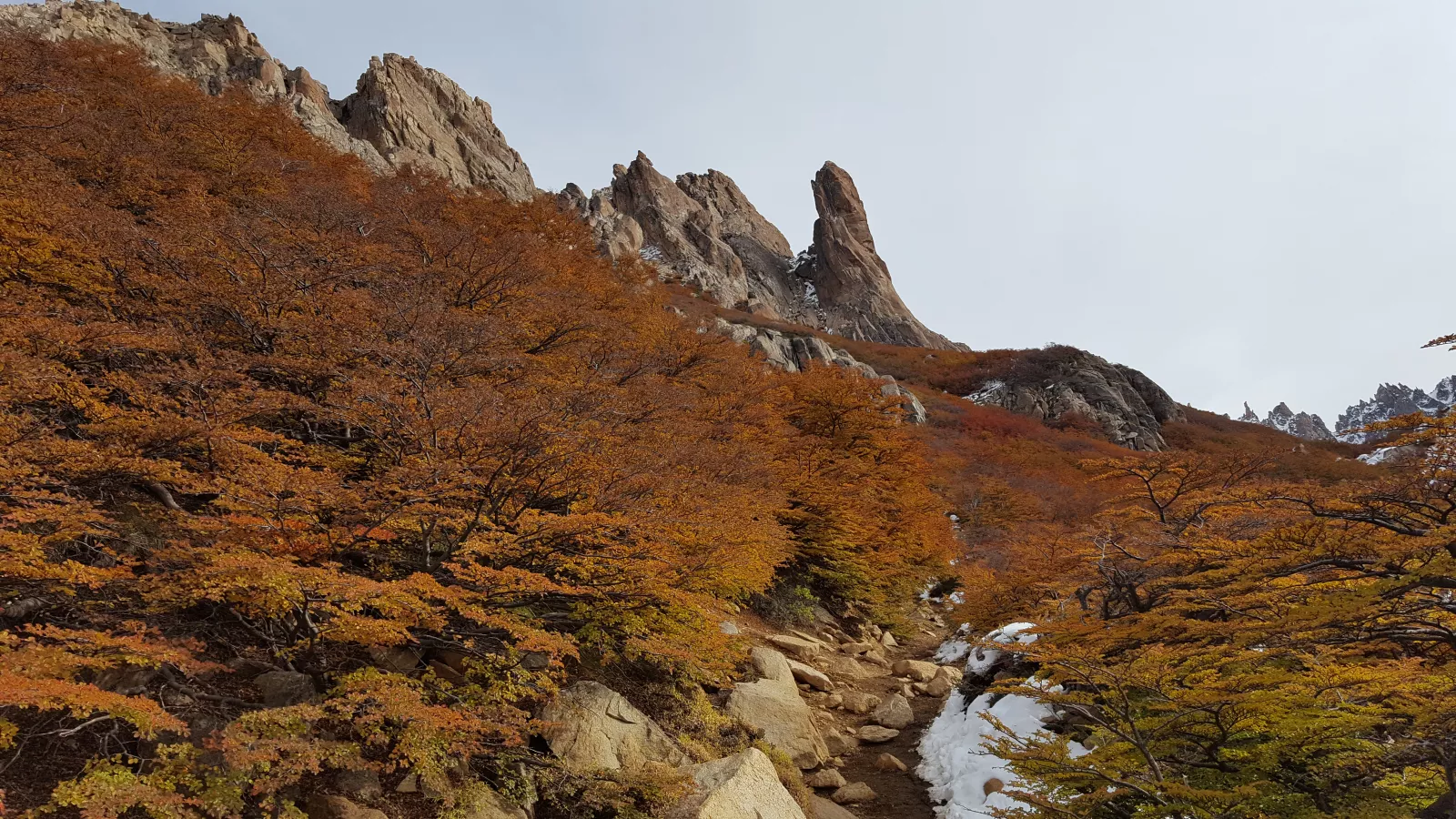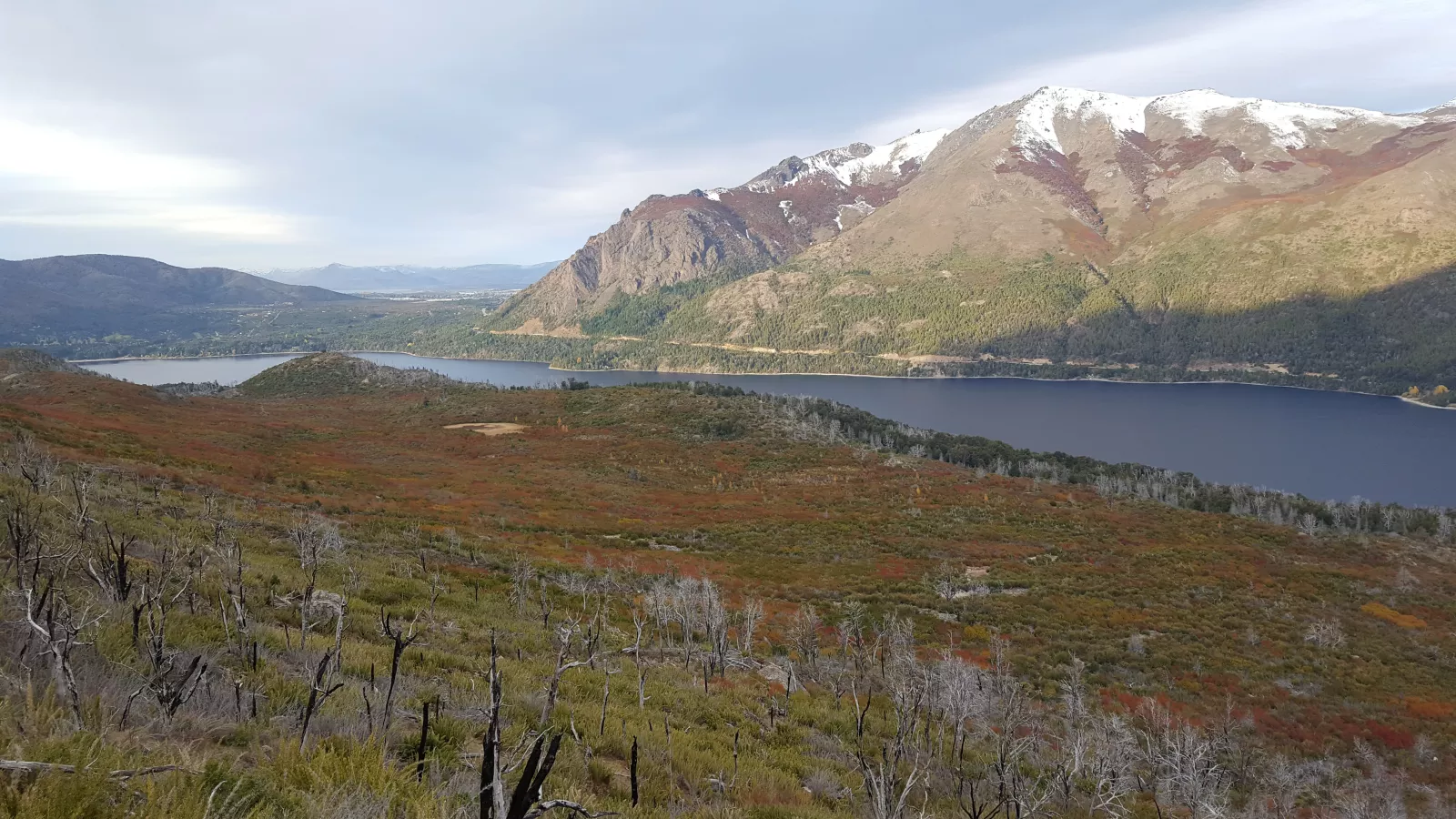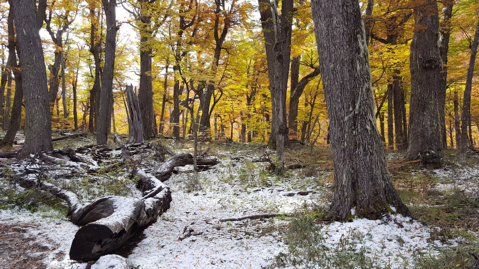 al principio camino por especie de bosque pero sin grandes árboles y luego durante más de 1 hora bordeando el lago por un sendero resbaladizo lleno de barro, malo para mí y para mis zapas y con cuidao porque a veces hay precipicio, bueno, pasado eso entro en especie de bosque muy lindo porque se veían partes nevadas que se mezclaba con el color rojo de algunos árboles, chulo