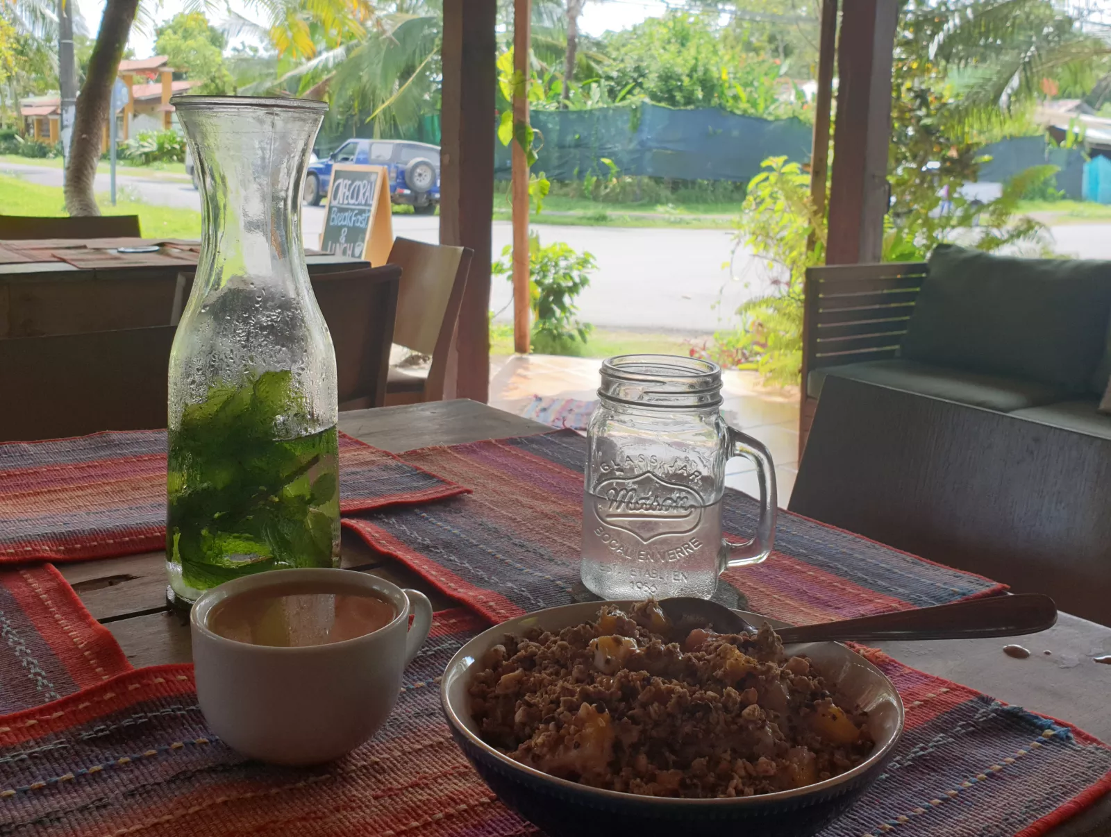 y he encontrado un sitio mono para desayunar unos cereales raros con fruta rara, pero riquísimo