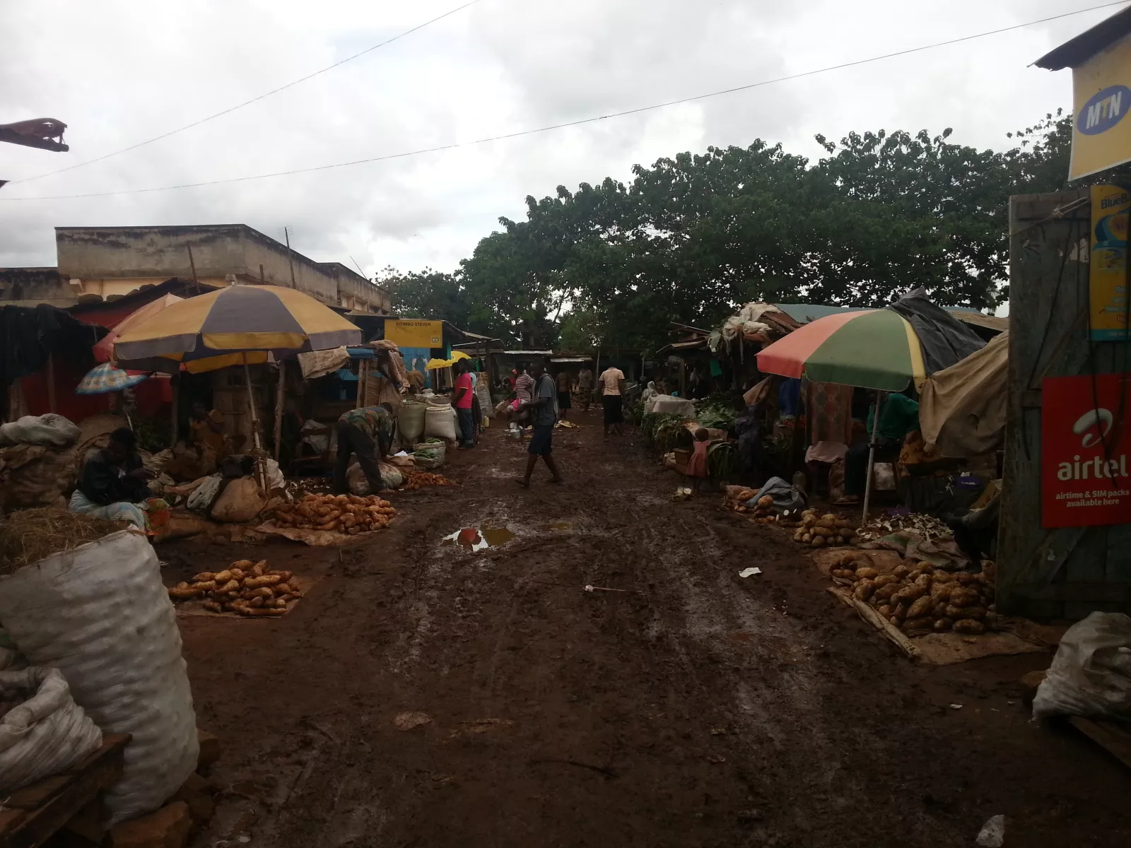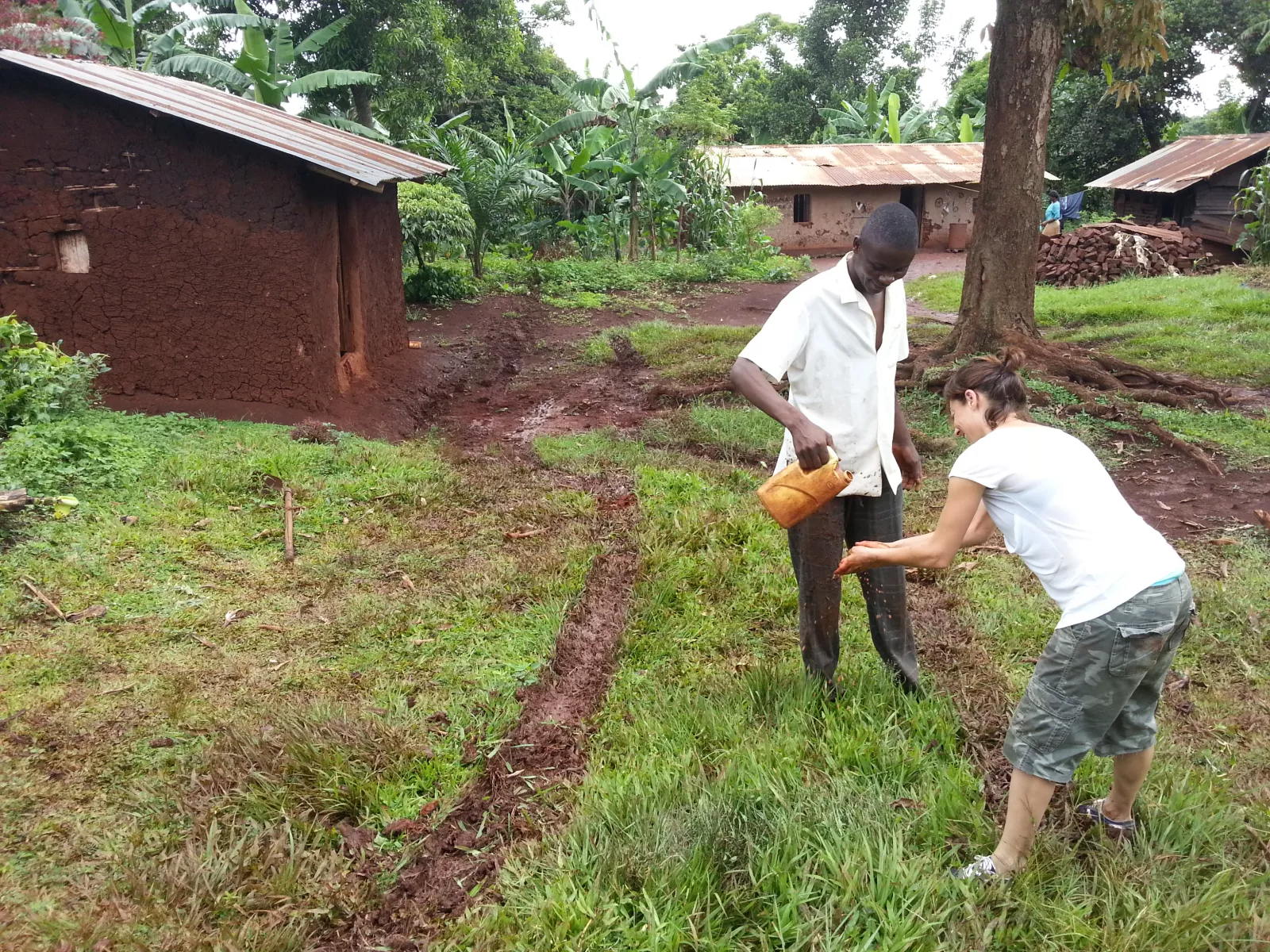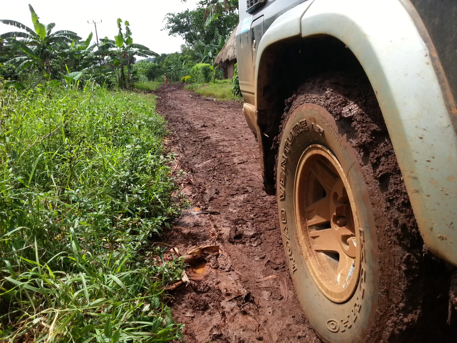ya ve nuestras caras de barro y sufrimiento y decide echarnos una mano, empezamos colocando unas piedras debajo de todas las ruedas para que el coche no patine, piedras que cuando salgo al camino a buscarlas paso por delante de una casita que había una señora trabajando la tierra con dos peques, un nene y una nena, de unos 3 añitos y cuando me ve la niña, sale corriendo hacia su madre y se pone a llorar, pobrecilla, la madre explicándola que soy un musungu, pero la niña, un berrinche, como si fuese mi culpa ser blanco, se pensaría que me la iba a comer, no sé, en fin, otro intento con el coche y parece que sí pero nooo, más piedras, otro intento y conseguimos moverlo 2 metros, yuuuuujuuuu, queda otro poquito para salir al camino.