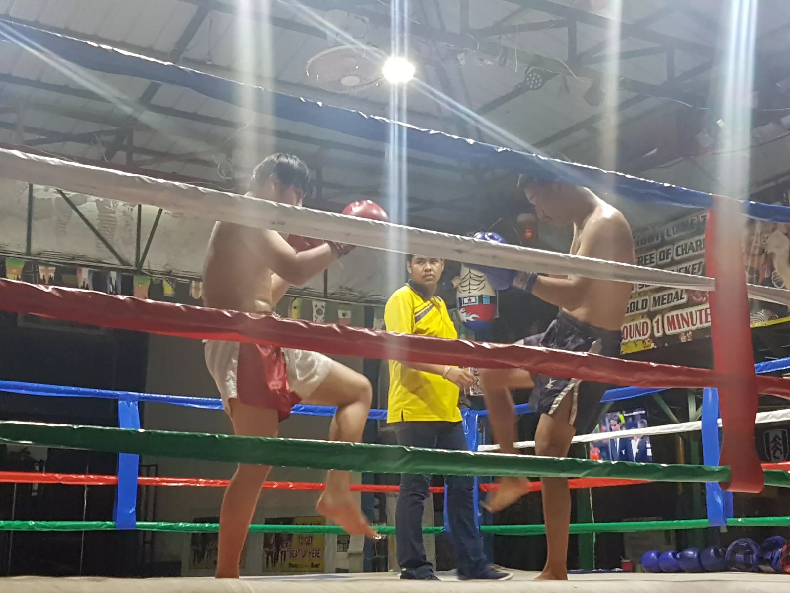 pues na, lo único que sabemos hacer, cerves, una mini siesta en la playa, café y enlazamos con las cerves de la precena, las cerves de la cena y las cerves durante unos combates de muay Thai, el primero entre lugareños, de mentira, pero molaba pensar que era real por como sonaban los golpes