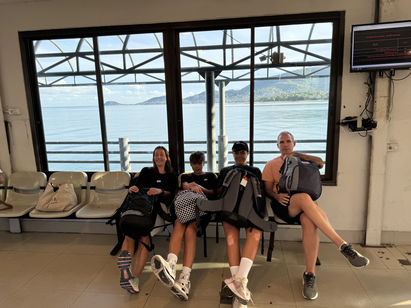 Ale, nos vamos a nuesto siguiente destino, isla Koh Phi Phi, en un viaje laaargo, primero pilla taxi y llegamos a la terminal del barco a las 07:13, muy felices se os ve
