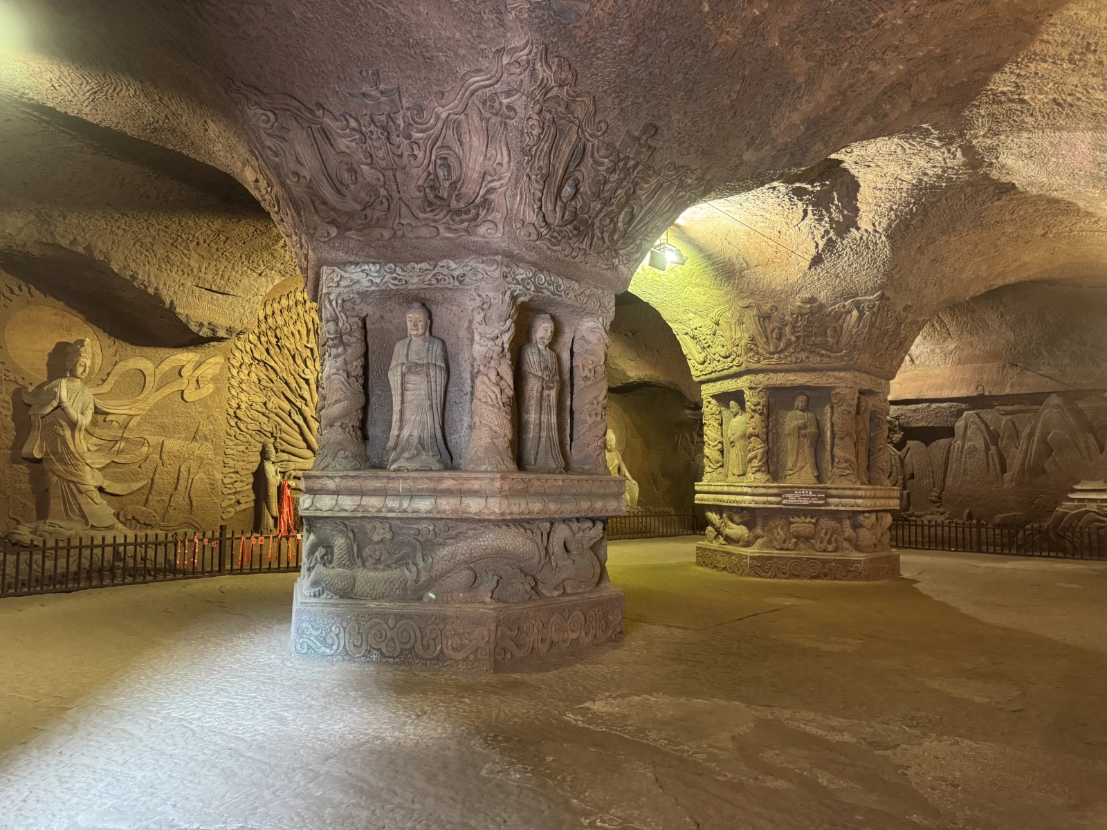 y pensaba que ya, que es imposible ver más cosas, pero de repente veo salir a gente por detrás de los pies del Buda y digo estarán dando la vuelta, pero no, salía y salía gente y digo, voy a ver y ya flipo, de nuevo una galería enorme con varias piezas enormes talladas sobre la pared, joeee qué chulo, es flipante, es increíble que esto esté metido aquí, hasta las pedazo columnas están talladas y molan mazo