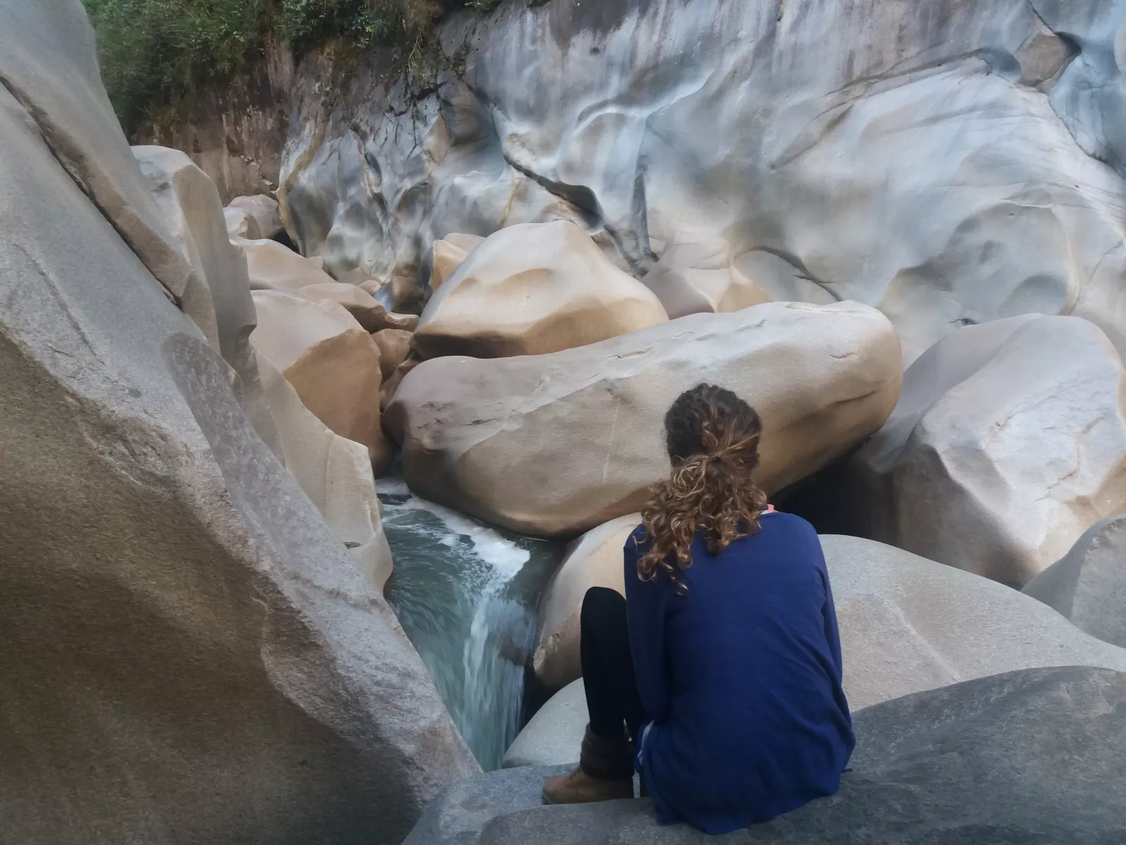 Pero lo mejor llegó por sorpresa, caminando escuché el agua de un río pero no se veía nada por la frondosa vegetación, a ver, había 4 ramitas, pero me apetecía poner esa palabra y salía un caminito hacia abajo, tiro, tiramos y llegamos a.… no sé, unas rocas gigantes y con extrañas formaciones, muy brillantes, y con un agua azulita entre ellas, era alucinante, muy chulo el lugar y nadie por allí, mejor, momento de paz.