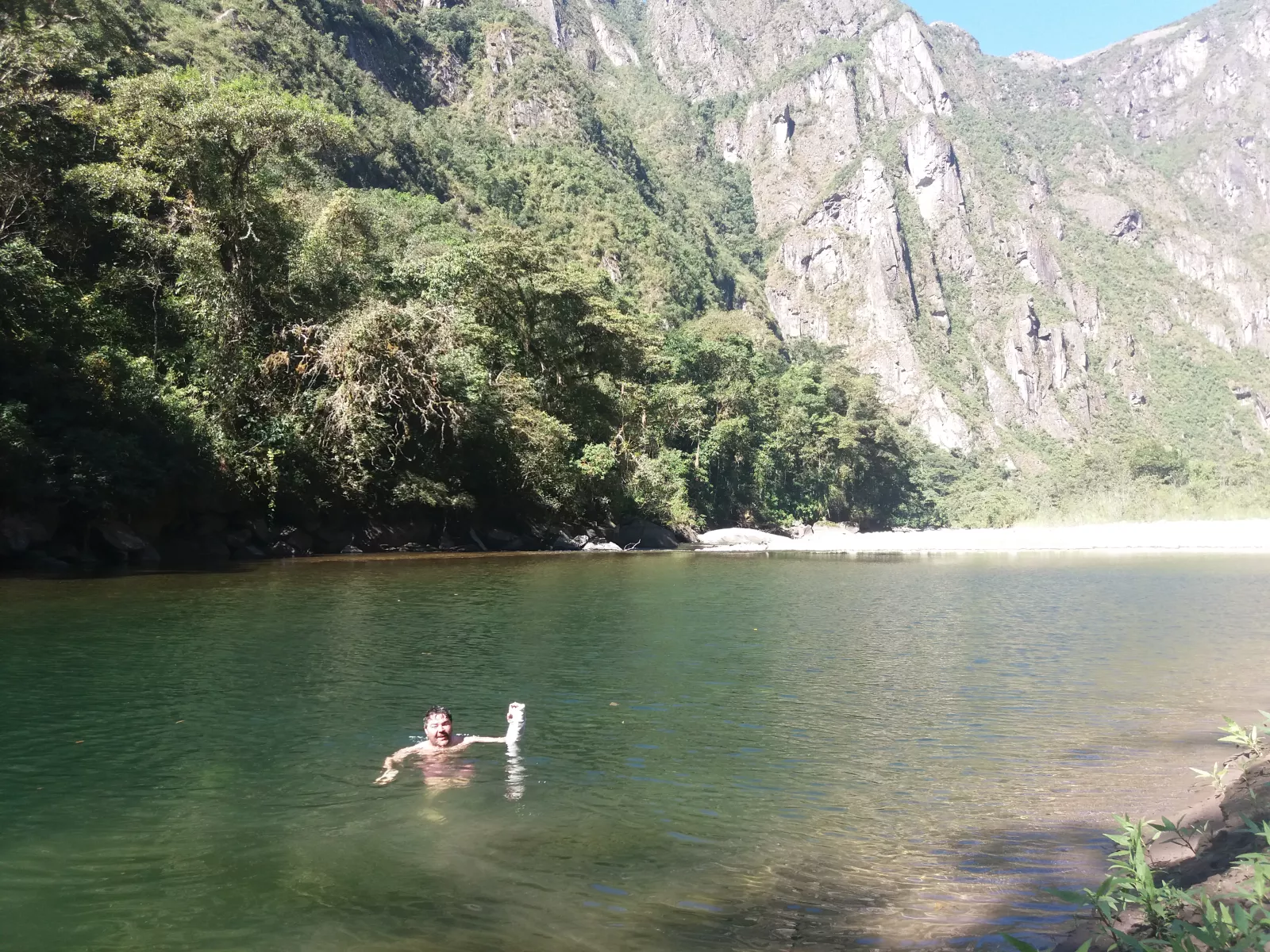 increíblemente vamos a muy buen ritmo y aquí probablemente venga de lo mejor del viajecito, como vamos bordeando un también río, vamos cuchicheando si nos bañamos, que sí, que no, que sí, que no, hasta que encontramos una pequeña calita casi perfecta para darnos un chapuzón de lo más refrescante, madre mía qué placer a pesar de que el agua estaba un pelín fría al principio, como todas, pero luego genial y Vicky con miedo por si había serpientes, a mí, como si me comen, sólo quería disfrutar al máximo ese momento de placer