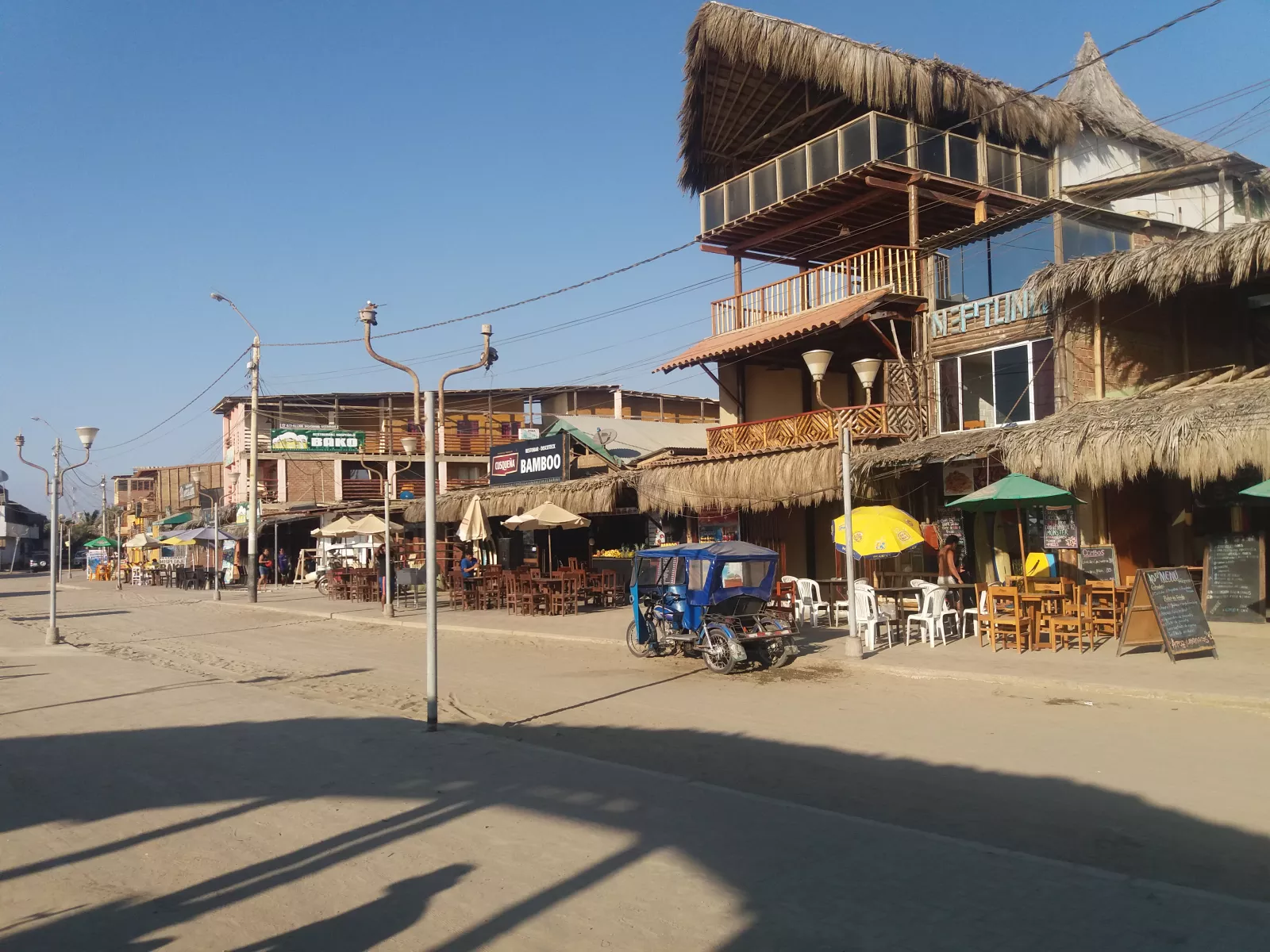 llegué a Piura, taxi al centro y otra van de 4 horitas eteeeerno hasta Máncora, pueblo surfero y se nota nada más entrar.