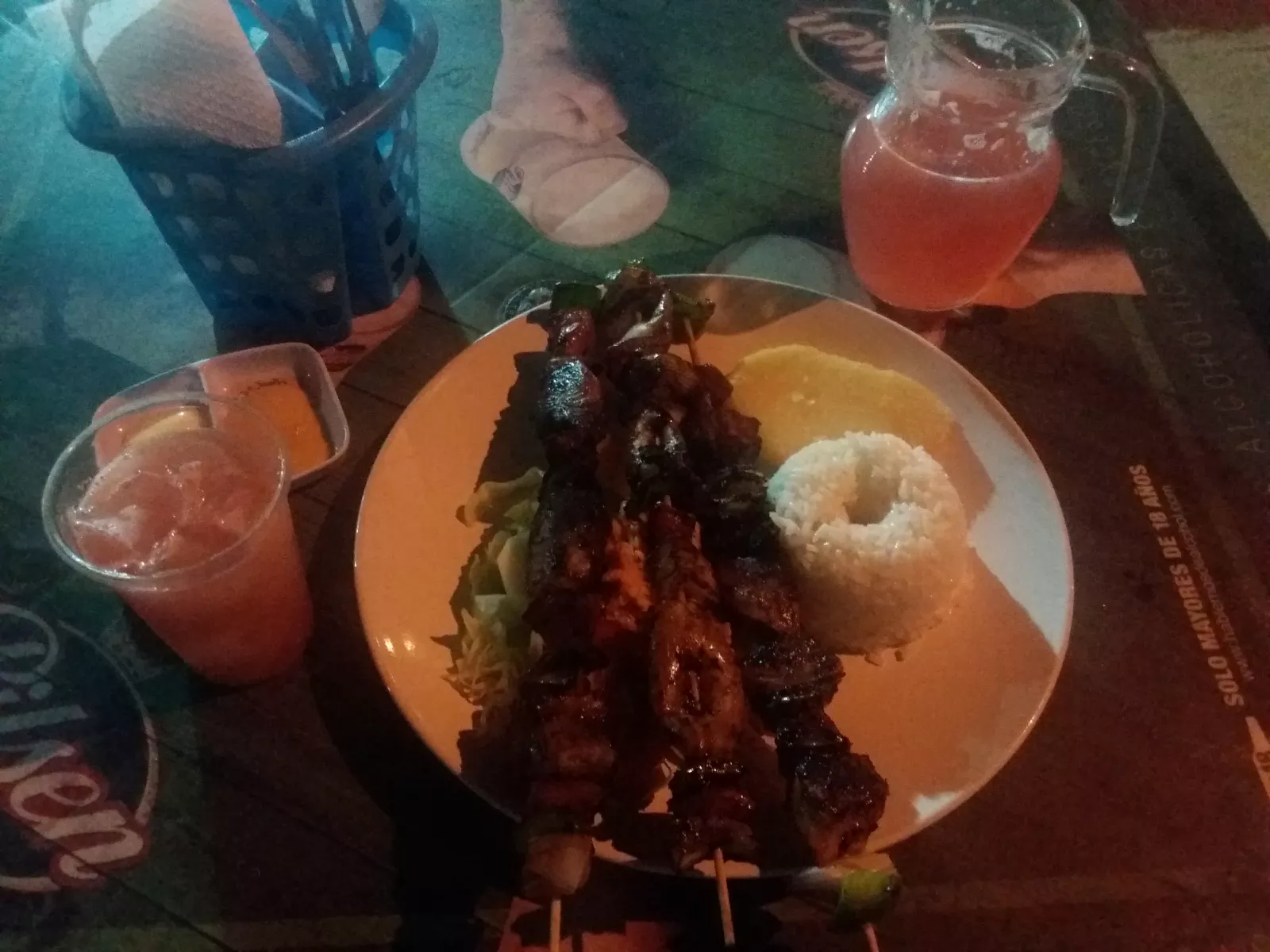 Llego, busco hostel, tiro mochila y portátil y salgo a respirar mar, es de noche pero estoy súper a gusto, qué paz... ceno en chiringo de playa algo riquísimo, una ensaladita con un par de brochetas de bonito, gambas, cebolla y pimientos a la barbacoa, salivo, pero porque muero de hambre también