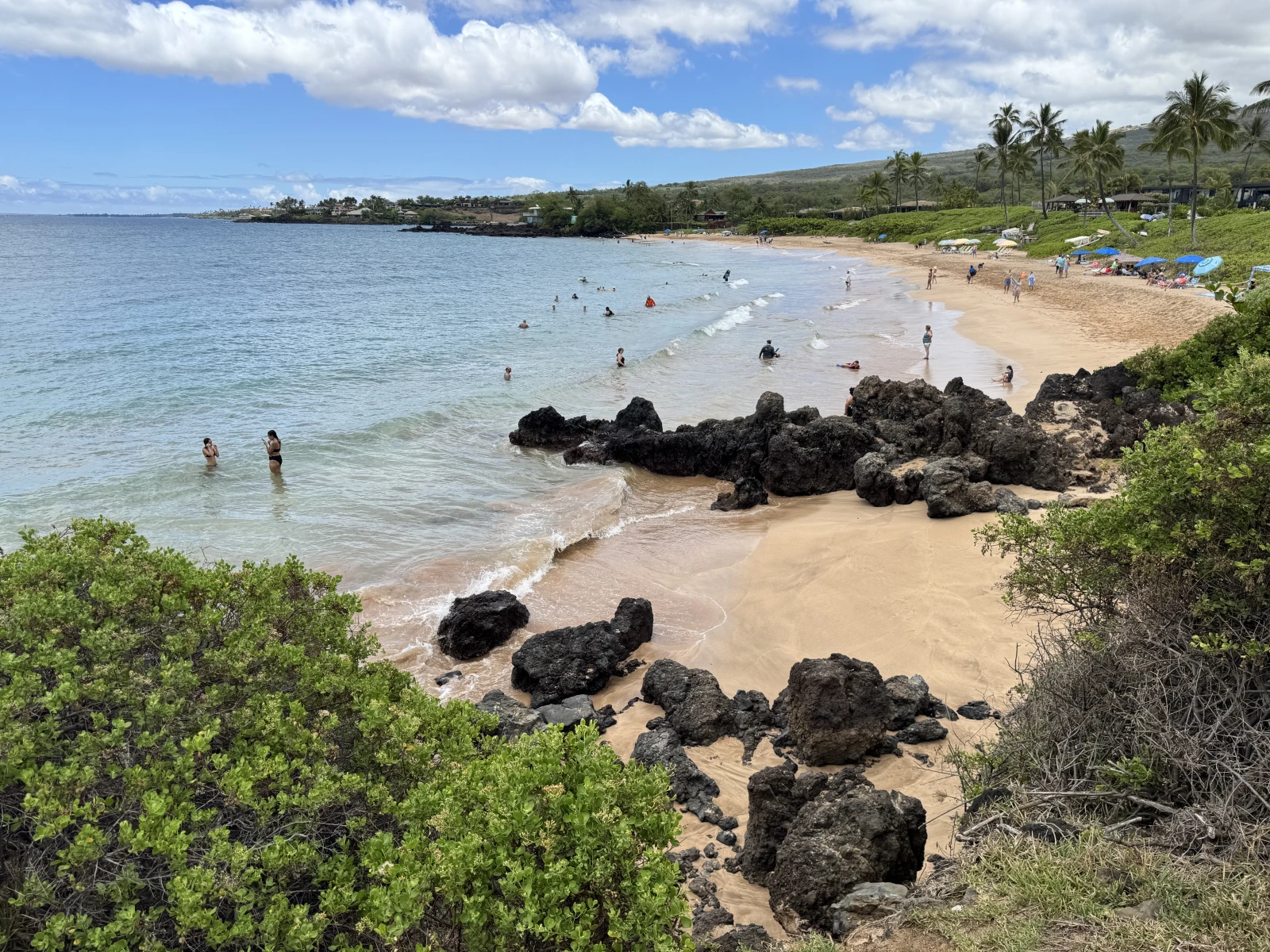 Pues visto, chulo, pero lo de media hora se lo inventan, 3 minutos, literal y hechos por mi, pero mi primera impresión de Hawaii, mola mucho esos montañones verdes y como me quedan un par de horas hasta hacer el checkin, me voy a la costa oeste a pegarme el primer chapuzón en la playa de Kanaapali y aquí viene la primera decepción después de la primera genial impresión, de que me sirve tener un Ferrari si no paso de 40? increíble que de coches hay, que de camiones, un solo sentido, he tardado 1 hora para 30 kms... y yo pensando que iban a ser como las carreteras de usa continente, infinitas y sin radares, pues toma, eso sí, la carretera mola bordeando la costa y ya se van playitas chulas con surferos y la playa está, madre mía lo que me ha costado aparcar, es la típica de resorts de lujo, flipo con la pasta que tiene la gente, está bien, chula, pero ves a más gente en las piscinas que en la playa, no lo entiendo.