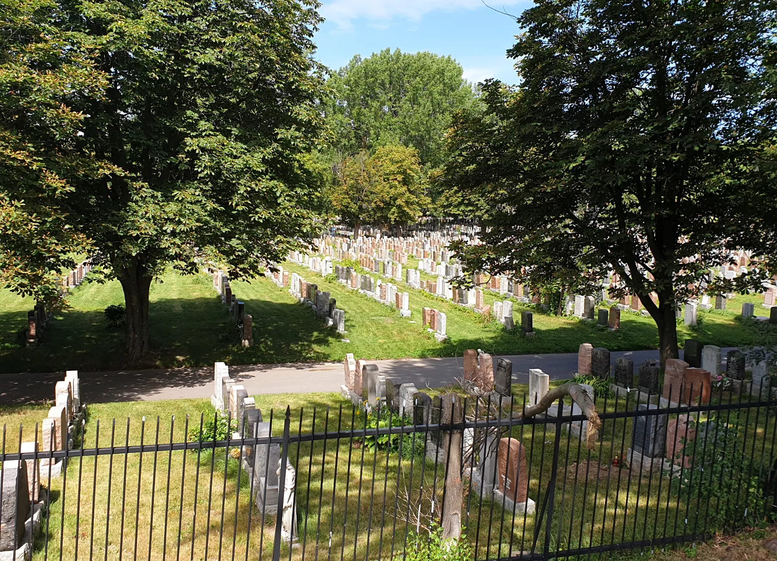 Listo, sigo pateada hasta la iglesia más grande de Canadá, primero paso por un cementerio típico de estos americanos, gigante y miles de tumbas, de ir al hoyo, nunca se sabe... prefiero esto antes que la mierda que tenemos en España, pero como mis amigos saben lo que quiero el día que muera, pedazo vacaciones se van a pegar, y joeee que casualidad, hace 4 meses estuve por Cudillero, donde me acerqué al cementerio de Luarca y dije lo mismo, ya que tienes que meterte en un nicho de estos, por lo menos que sea bonito el lugar, y aquel, me lo pareció, con vistas al mar, que evidentemente son para los que están arriba rezando a los que están abajo... bueno, ya lo dejo