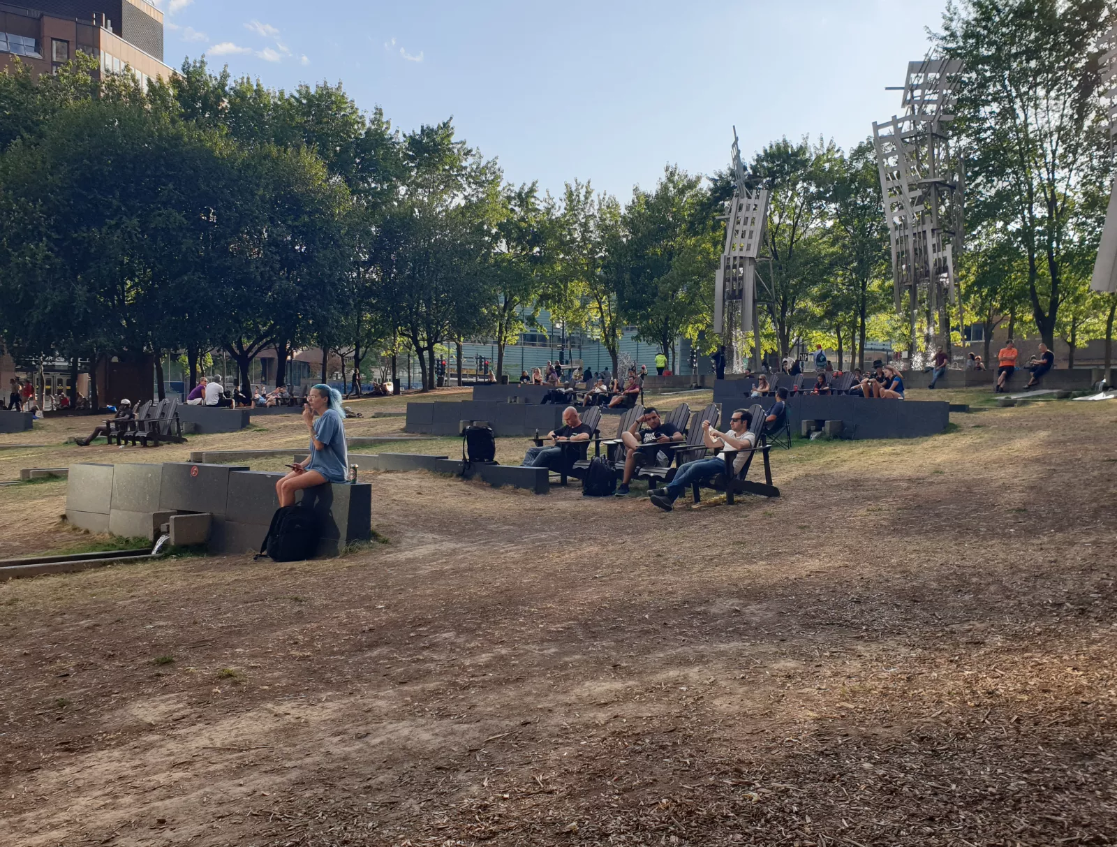 me voy al Mont Royal ese, es una montaña tipo retiro, un parque gigante en medio de la ciudad donde va la gente a pasear, correr, bici, yo, a mi ritmo, sin agua y pa empezar, doscientos mil escalones, roto, en serio, para llegar a un mirador con mil guiris para ver vistas de la ciudad, que la verdad, no me han molado tanto, no sé, es rara esta ciudad, pongo solo foto de panorámica que es la que mejor se ve toda la ciudad