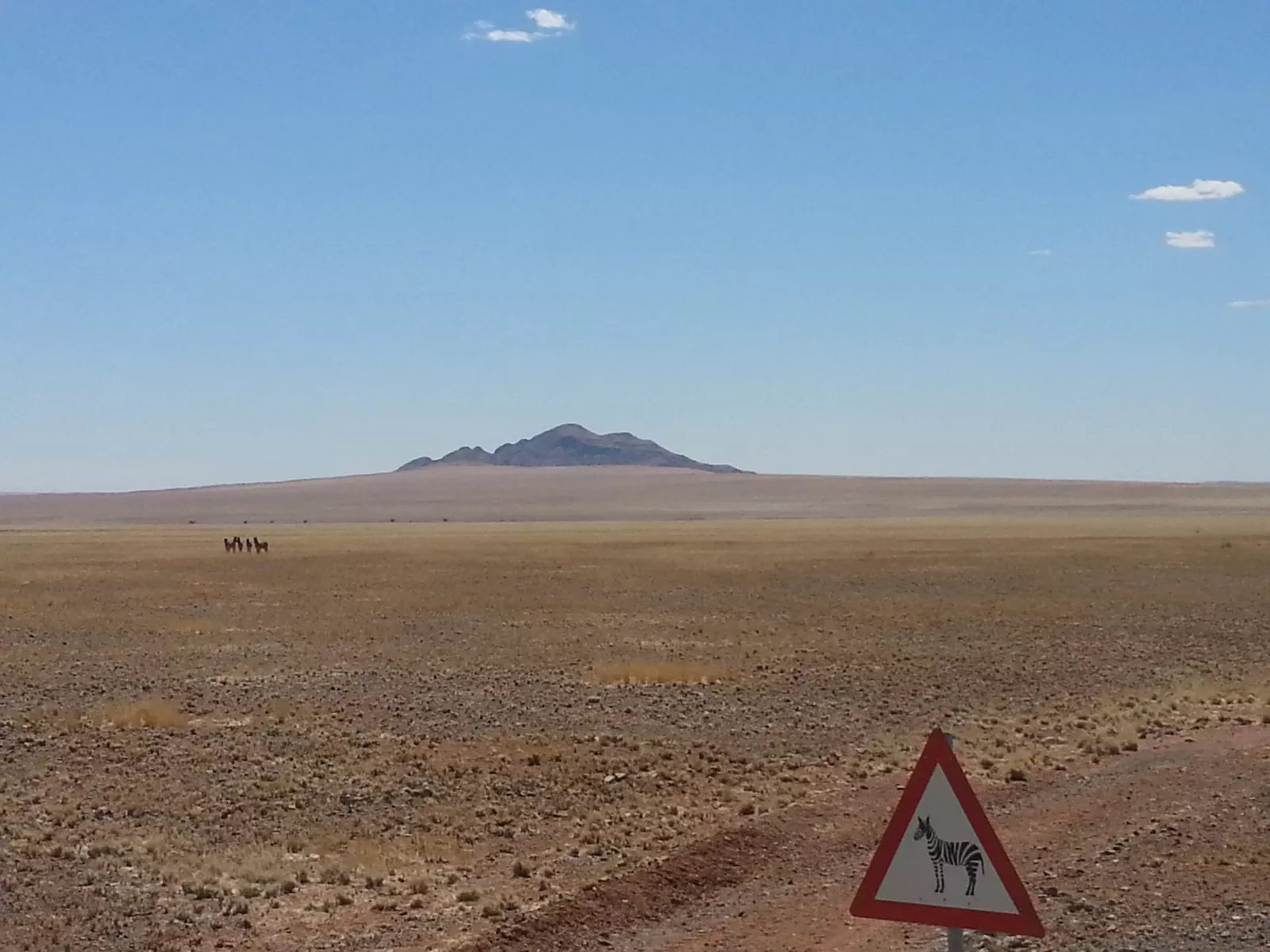 vamos por el camino y cebras, la primera vez que las veo en mi vida, en medio de la puta nada, no sé de qué se alimentarán, van a morir… pero son igual que cuando las ves en la tele, tienen rayas… pero lo mejor ha sido que había una señal de estas de tráfico advirtiendo que hay... cebras, buenísimo, para mí, claro.