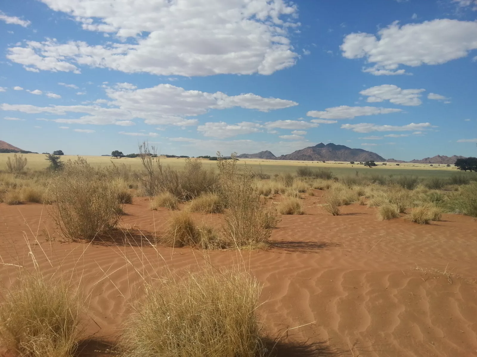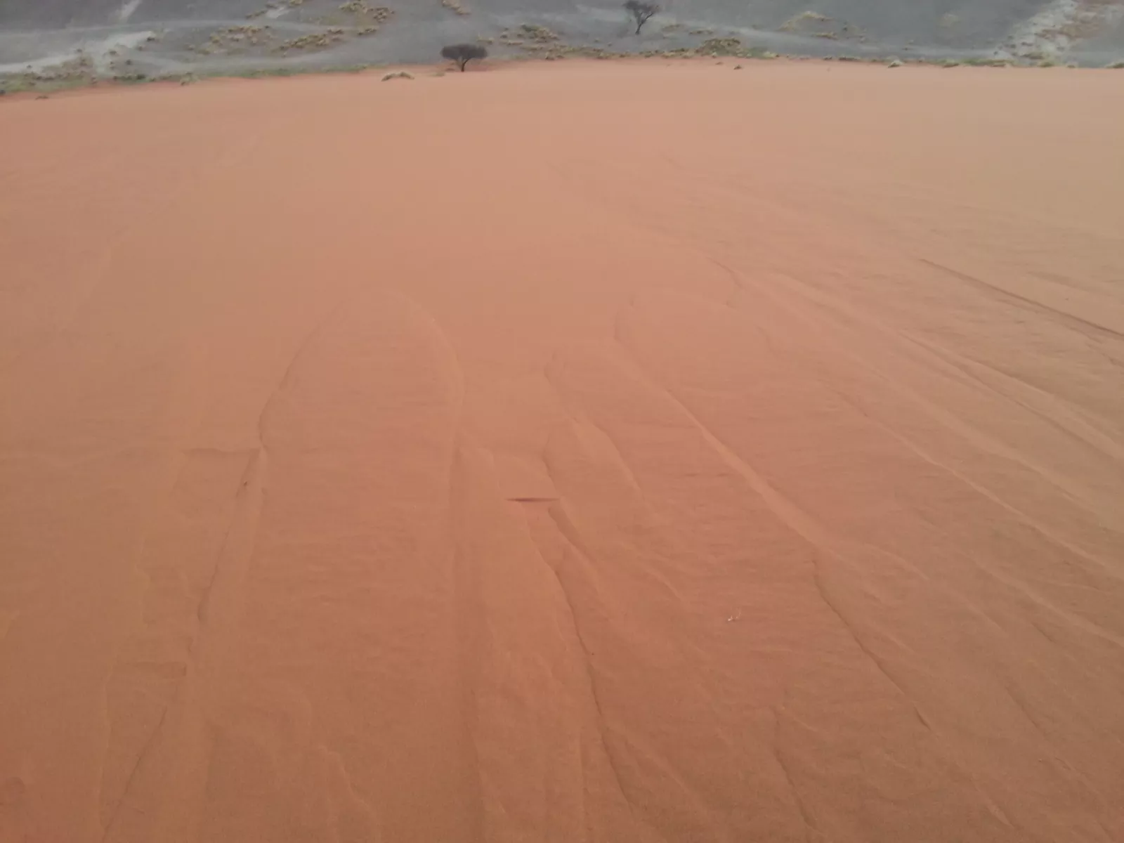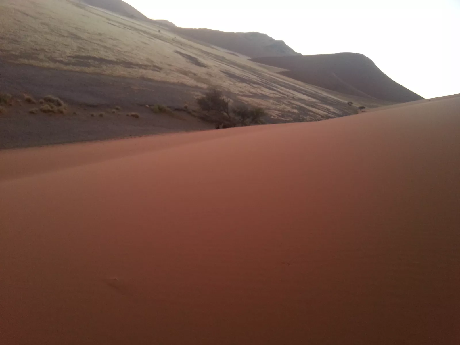 y como mi inglés no da pa mucho, las prisas eran debidas a que íbamos a una duna a ver el amanecer, en el Namib Naukluft National Park ese, después de un rato, llegamos, y joder, es chulo, esto es desierto desierto, dunas por todos los lados pero también se ve algo de vegetación, poca, pero se ve… y eso que estamos en épocas de lluvias, me parto