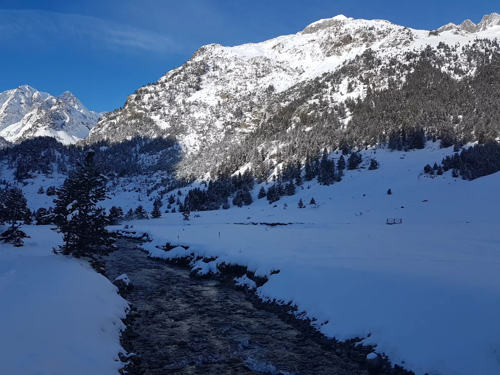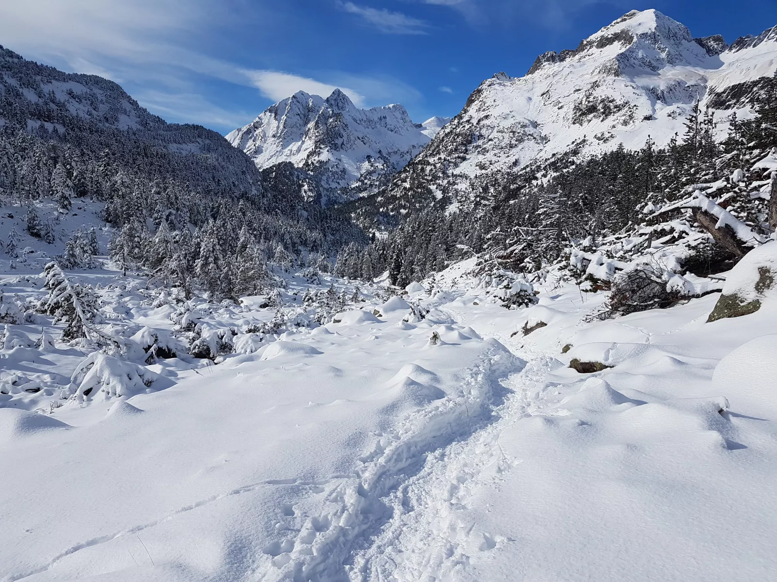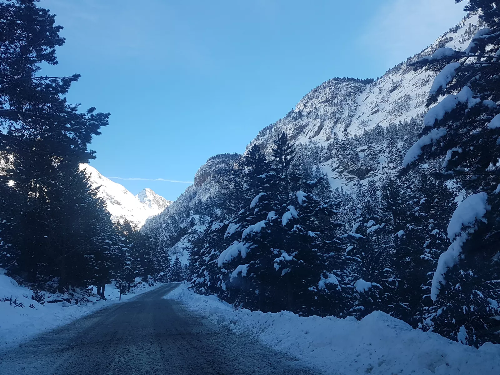 dicho y hecho, a 12 kms de Benasque está Hospital de Benasque, iluso de mí, es una zona/parking/hotel/restaurante y donde empieza, según vi, un sendero de ski nórdico de ese, de hecho cuando llegué a las 10:45, tuve que dejar el coche casi en doble fila muy muy mal, pero como mola la carretera para bajar al valle este, toda nevada, pasando las máquinas quitanieves, por fin