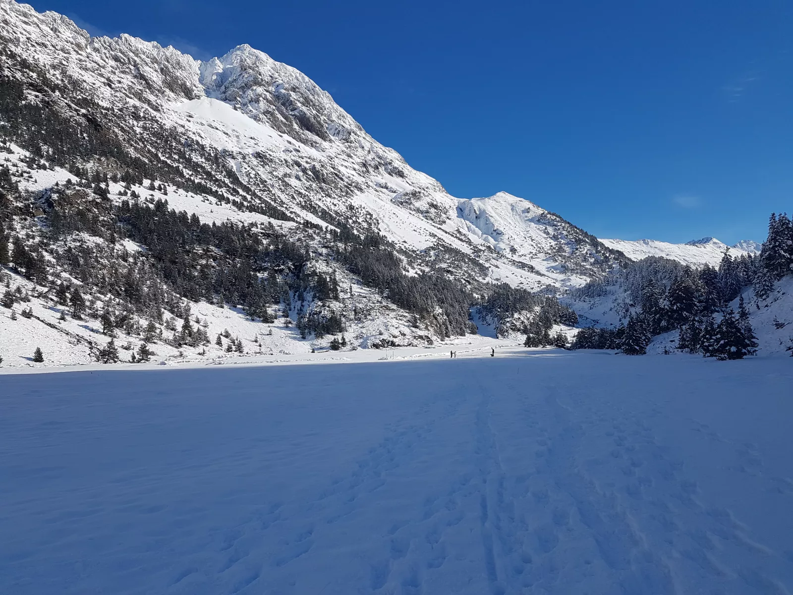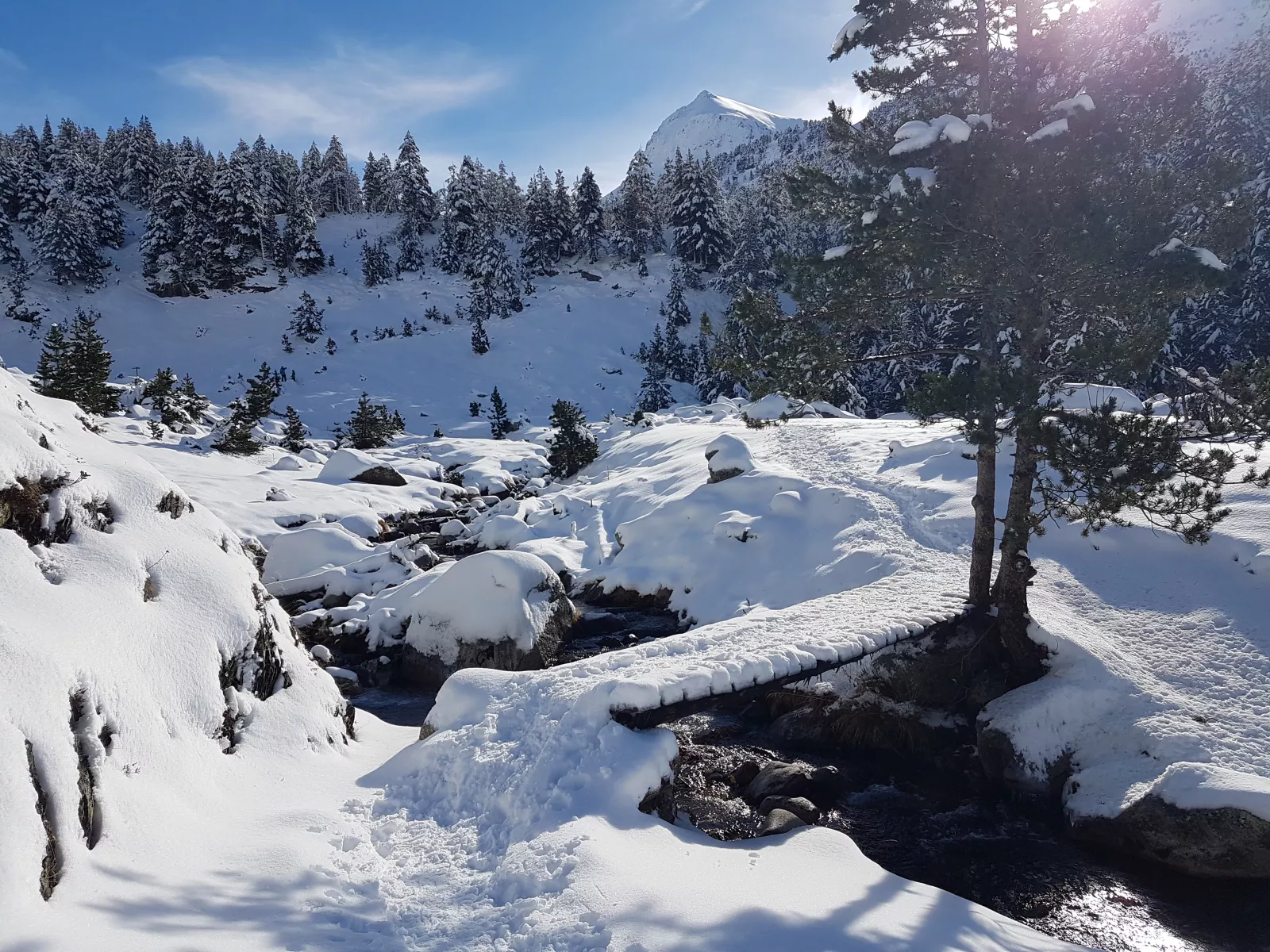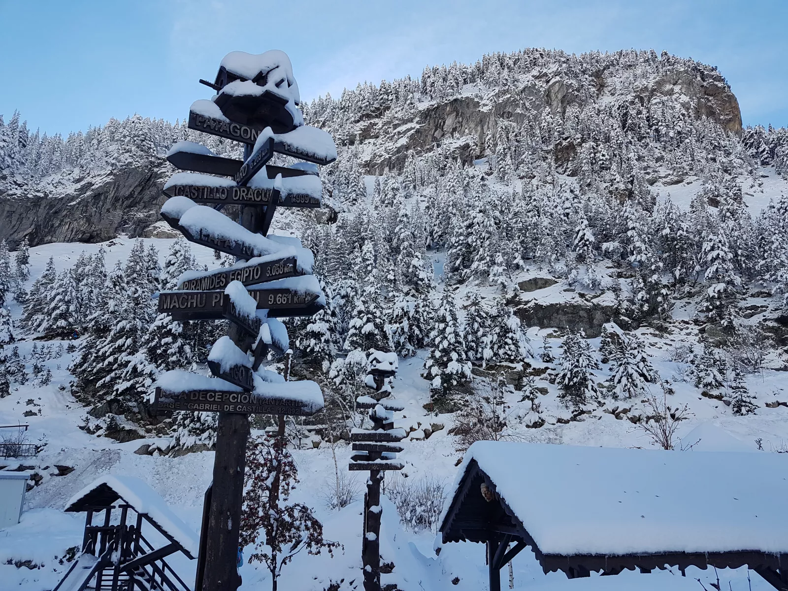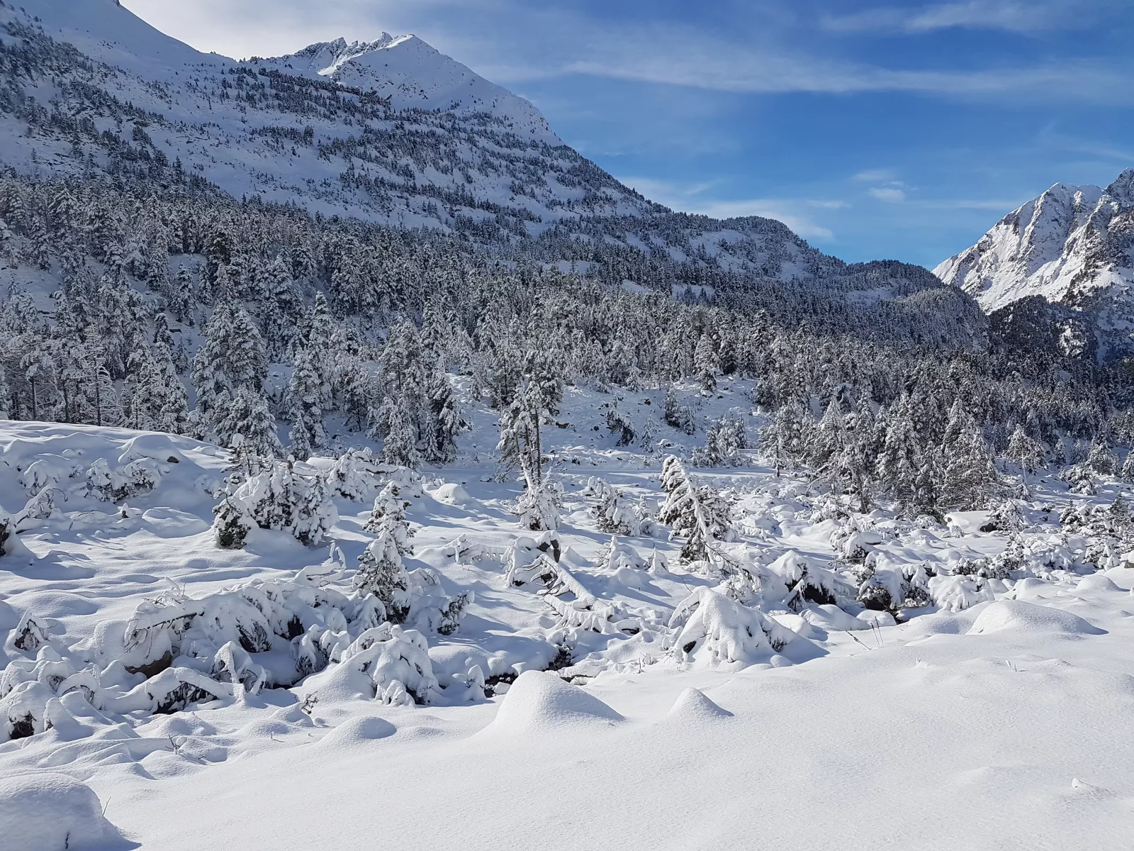 dicho y hecho, a 12 kms de Benasque está Hospital de Benasque, iluso de mí, es una zona/parking/hotel/restaurante y donde empieza, según vi, un sendero de ski nórdico de ese, de hecho cuando llegué a las 10:45, tuve que dejar el coche casi en doble fila muy muy mal, pero como mola la carretera para bajar al valle este, toda nevada, pasando las máquinas quitanieves, por fin