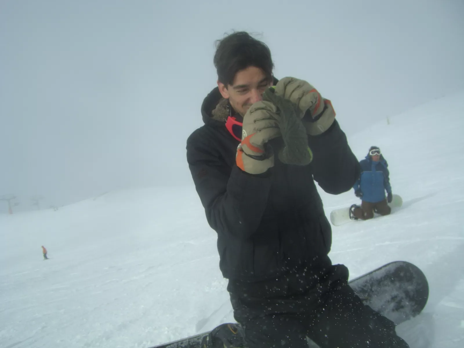 se cambian estos, me cambio y a desayunar, muuu rico el café pero yo solo quería estar en la cama, pero bueno, a darlo todo como siempre! pero duró poco la alegría, a los 5 minutos, manu, después de tomarse una barrita energética de esas se vino abajo y sin más, se fue, si es que… en la nieve no necesitas esas movidas, mientras nosotros seguimos bajando y haciendo lo que podemos, no damos para mucho y menos con un tiempo asquero, pero ahí estábamos