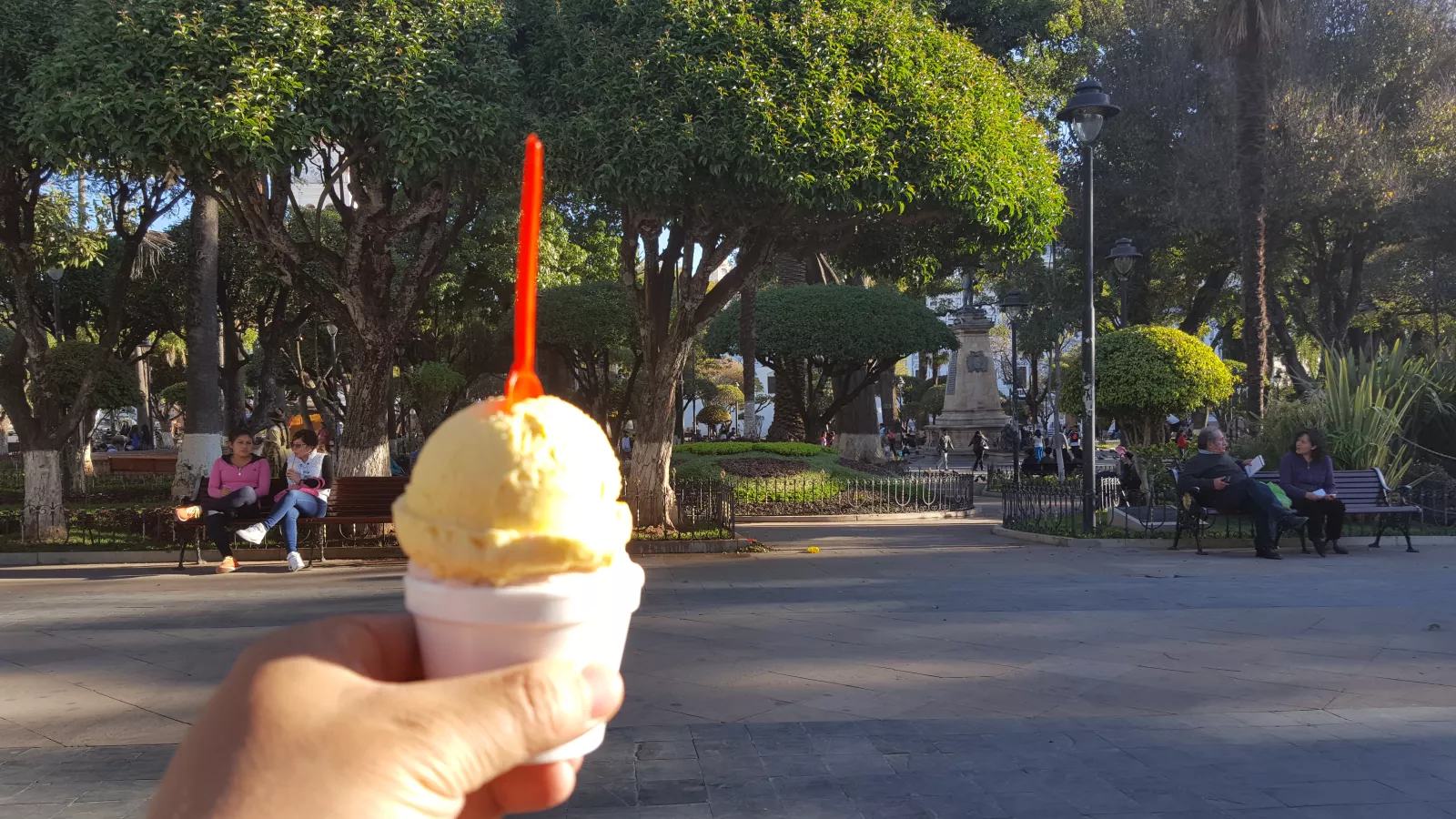 y pensando en el postre, que ya había echado un ojo antes a una tiendecita, la digo que la invito al postre, caminamos hasta la plaza y entramos en una heladería, muero, vaya heladito rico de maracuyá y fresa que nos comimos en la plaza tiraos en un banco, genial