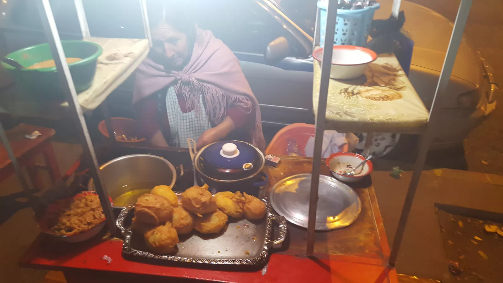 Y de nuevo, vuelta al centro, típico paseo buscando la cena, pillamos en un puestecito una papa asada con queso y salsa picante, qué rica