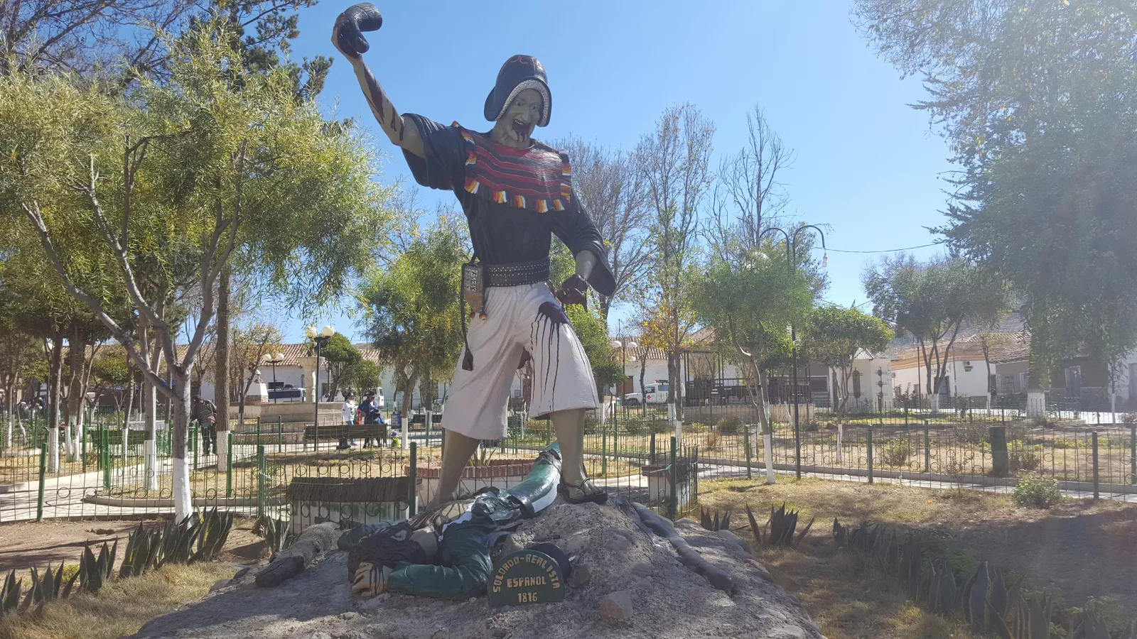 llegamo a la placita del pueblo donde he visto una cosa que me he descolocado, tras varios días por aquí notas como nos tienen un poco de… no es manía, pero notas que no caemos bien, y de pronto veo una estatua como de un guerrero matando al soldado español, parecía hecha con saña