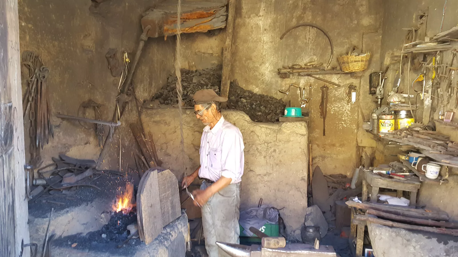 Lo mejor de todo ha sido encontrarnos un rinconcito donde había un hombre ya mayor fundiendo metal y construyendo herramientas, parecía que estábamos en la prehistoria, una imagen que me ha encantado. El hombre movía una cuerda de arriba a abajo continuamente y accionaba un soplador que hacía aumentar la llama y el calor para fundir, alucinante verle y luego, sacaba la herramienta y a martillazos para trabajarla, solo por este hombre ya merecía la pena el viaje hasta aquí.