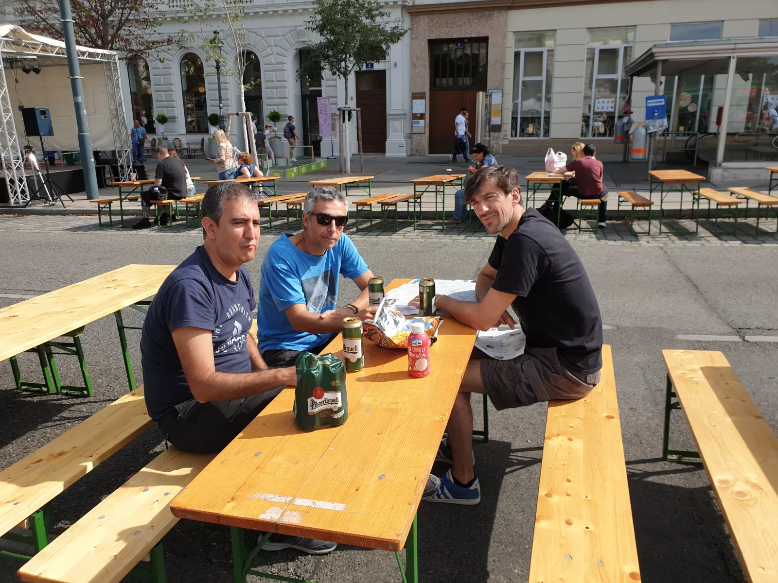 Hoy había fiesta más rollo alternativo, más jóvenes también, ayer eran de la quinta de Antonio y también todas muy bien, me encantan las vienesas y creo que a estos también, y a por la primera copilla, la segunda, tercera y cuarta, es un no parar, hasta nos movíamos algo, poco, pero se veían ahí los cuerpos dando como espasmos, la gente igual, a su rollo, sus bailes, sus canciones porque iban mezclando internacional con austriaco, mola su música, la verdad que la noche estuvo muy bien