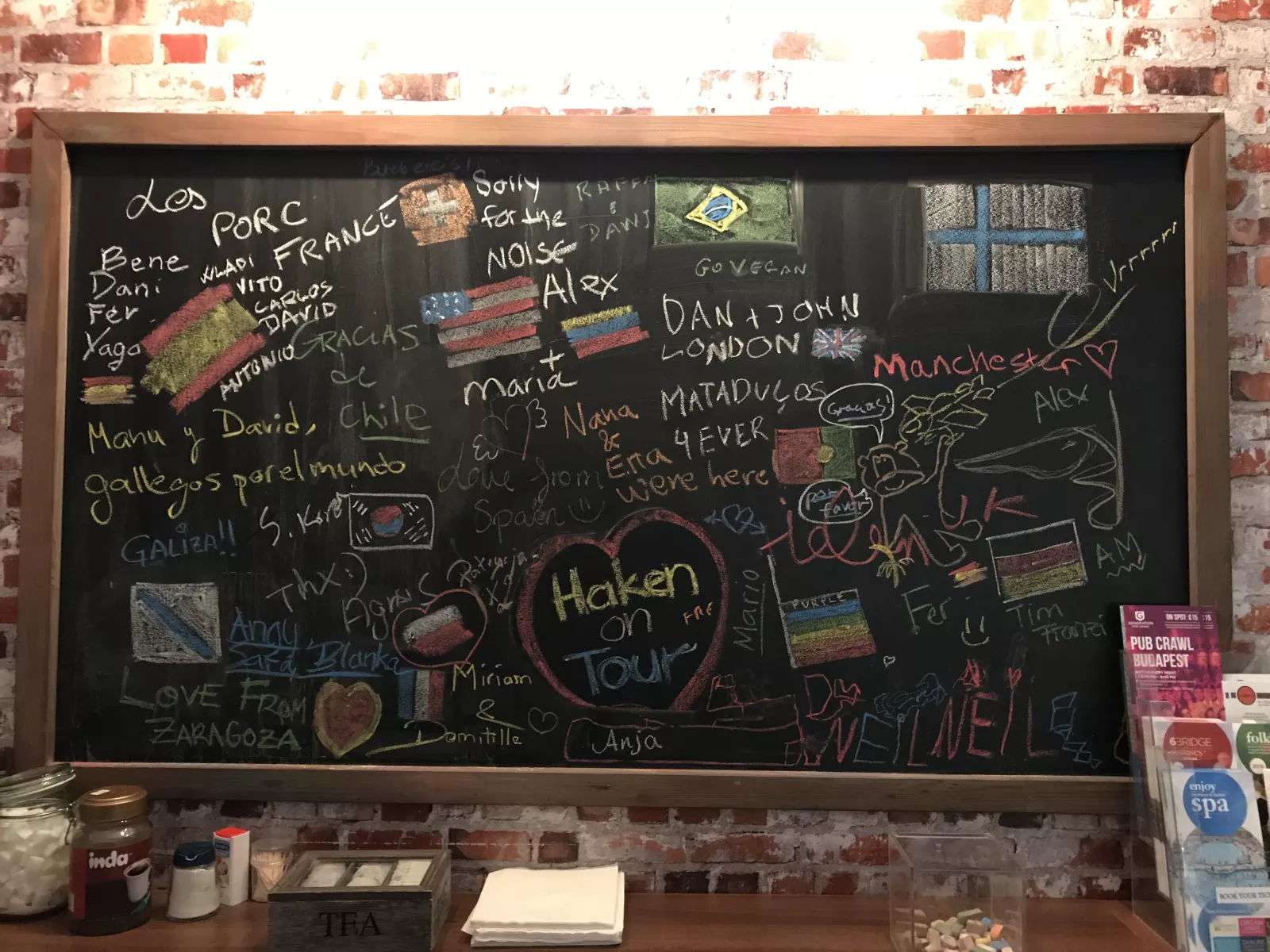 Al final no me dormí nada, pero sí aproveché para descansar, lo necesitaba, lo necesito y lo necesitaré siempre, nací cansao.... y llegaron estos al hostel, que tenía dos cosas chulas, la recepcionista y el cartel, donde dejaron nuestra firma